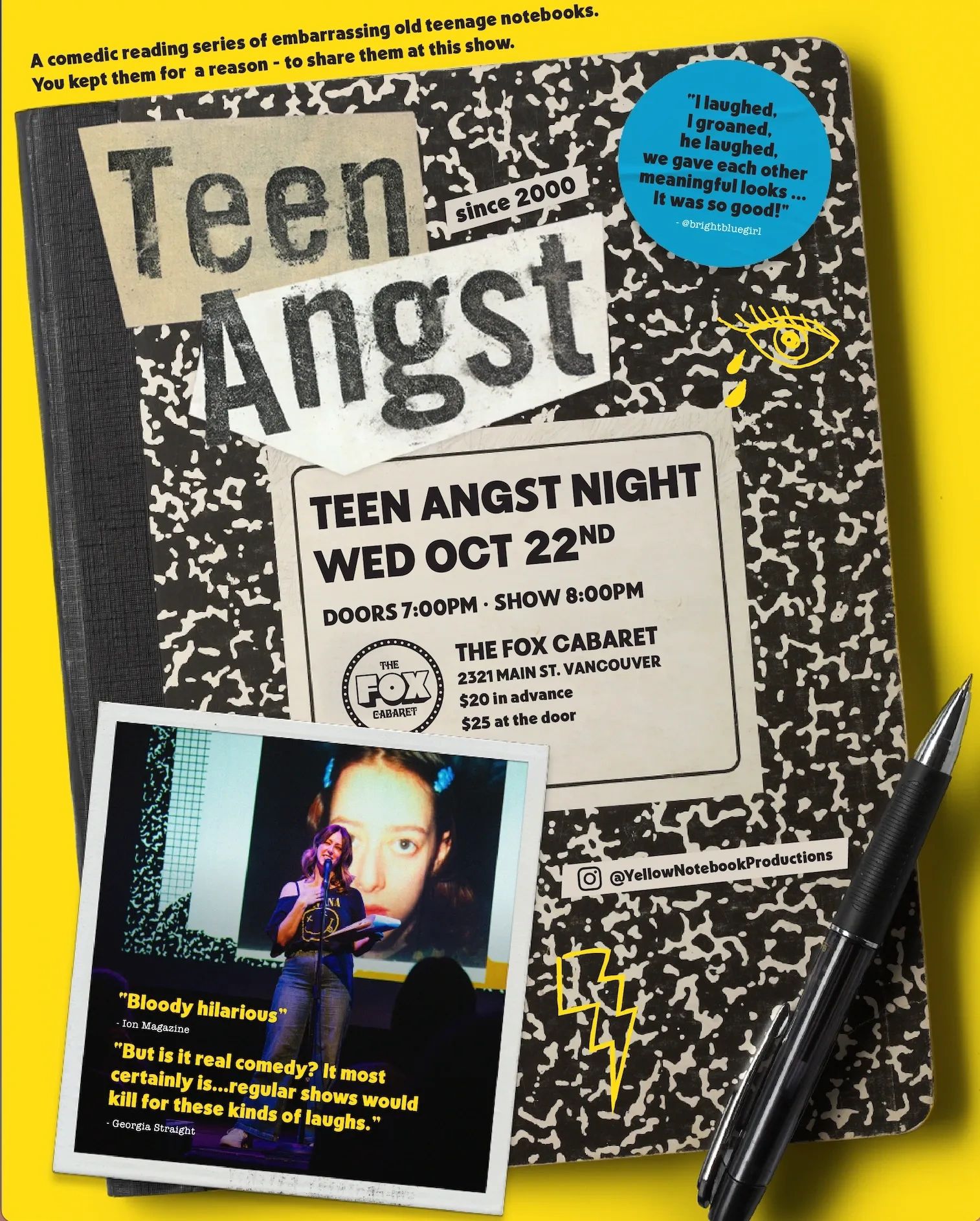 So excited and NERVOUS to be reading some truly cringe-worthy writing from my angsty teen years. Written with a bic pen on a lined binder paper, it promises to be an unforgettable night.